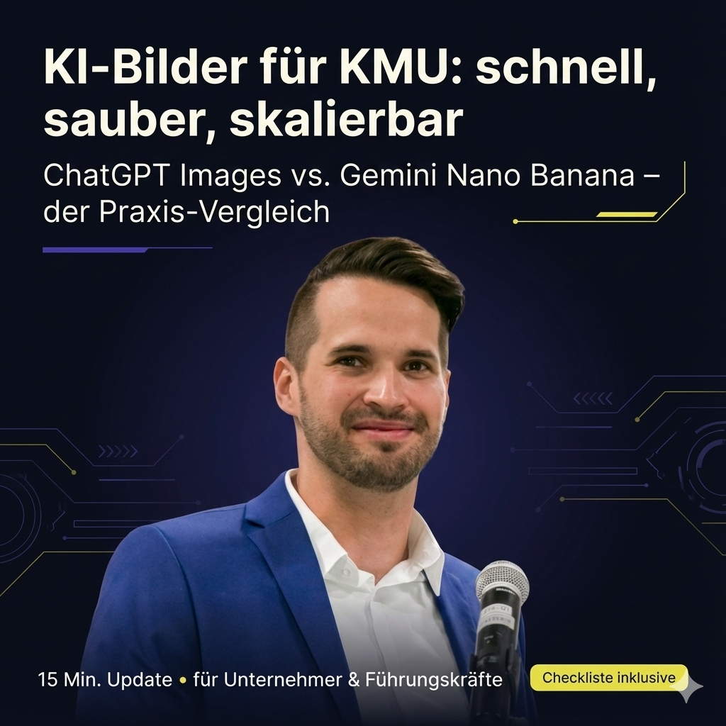 Setup (mit hochgeladenem Foto): Nutze das hochgeladene Foto als Ausgangsbild. Erstelle ein 1:1 LinkedIn-Visual im Premium-Tech-Beratungsstil. Dunkler Navy-Background mit subtiler Vignette (#0A0B12 → #111428), Akzente in Violett (#4E36A3) und Gelb (#E7E248), Text in #FFFCF1. Layout: Oben: Headline (groß): „KI-Bilder für KMU: schnell, sauber, skalierbar“ Mitte: Subline: „ChatGPT Images vs. Gemini Nano Banana – der Praxis-Vergleich“ Unten links: Datum/Format: „15 Min. Update • für Unternehmer & Führungskräfte“ Unten rechts: kleines Badge gelb: „Checkliste inklusive“ Wichtig: Text muss extrem scharf und fehlerfrei sein, sauberes Grid, viel Whitespace, keine Logos, keine Screenshots. Erzeuge 1 Version.